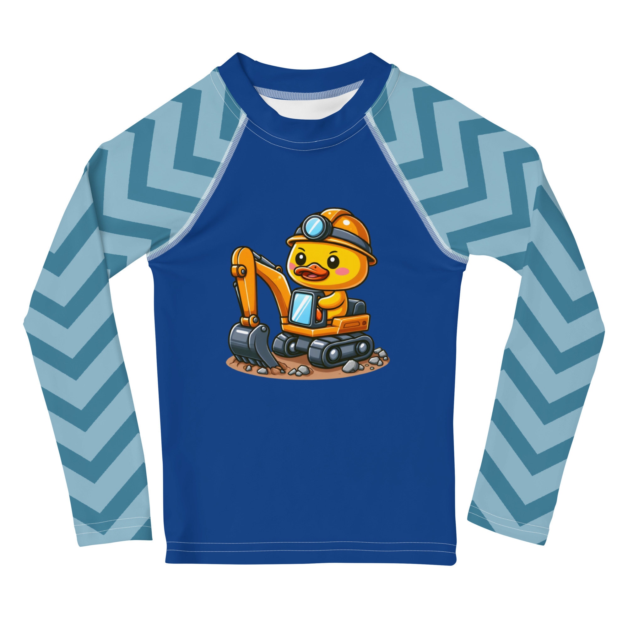 Get your little ones ready for fun in the sun with this adorable Kids Rash Guard featuring a ducky driving an excavator! Made with sun-protective fabric, it keeps them safe from UV rays while they play at the beach or pool. With its long sleeves and body, it's perfect for all-day adventures. Whether splashing in the waves or enjoying indoor activities, this colorful rash guard ensures they stay comfortable and protected.
